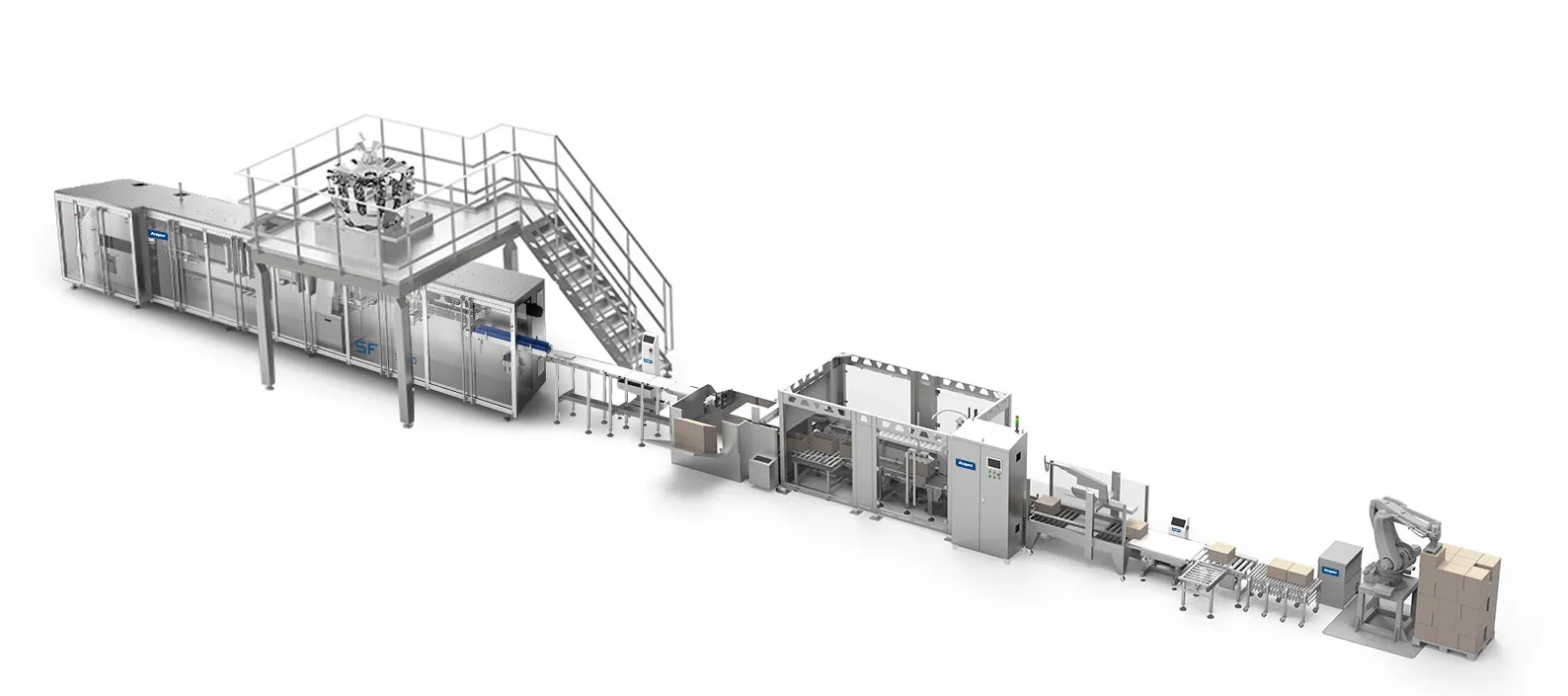 Full-process unmanned operation: From product packaging to palletizing and storage, no manual intervention is required. Only operators need to monitor the equipment operation status through the human-machine interface, reducing labor costs and human operational errors. For example, in the pharmaceutical industry, full-process unmanned operation can prevent direct contact between personnel and drugs, reducing the risk of drug contamination, and meeting the GMP standards of the pharmaceutical industry.